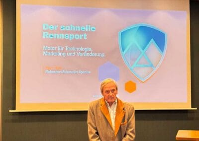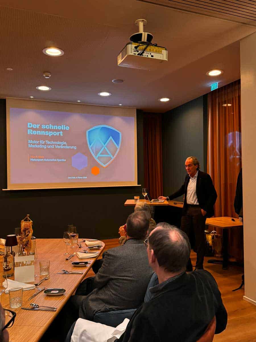 In seinem Referat «Der schnelle Rennsport – Motor für Technologie, Marketing und Veränderung» nahm er uns mit auf eine spannende und faszinierende Reise: vom Beginn seiner Karriere als Rennfahrer, die er parallel zu seinem Maschinenbaustudium an der ETH/EPFL lancierte, über die Stationen beim Sauber-Team mit dem zweimaligen Gewinn der Sportwagen-Weltmeisterschaft und den 24 Stunden von Le Mans mit Sauber-Mercedes bis hin zum erneuten Triumph fünf Jahre später in Le Mans als Rennleiter bei Porsche. Weitere Stationen waren die Position des CEOs der Rennserie V8STA und die Rolle des Teambesitzers des A1 Team Switzerland.